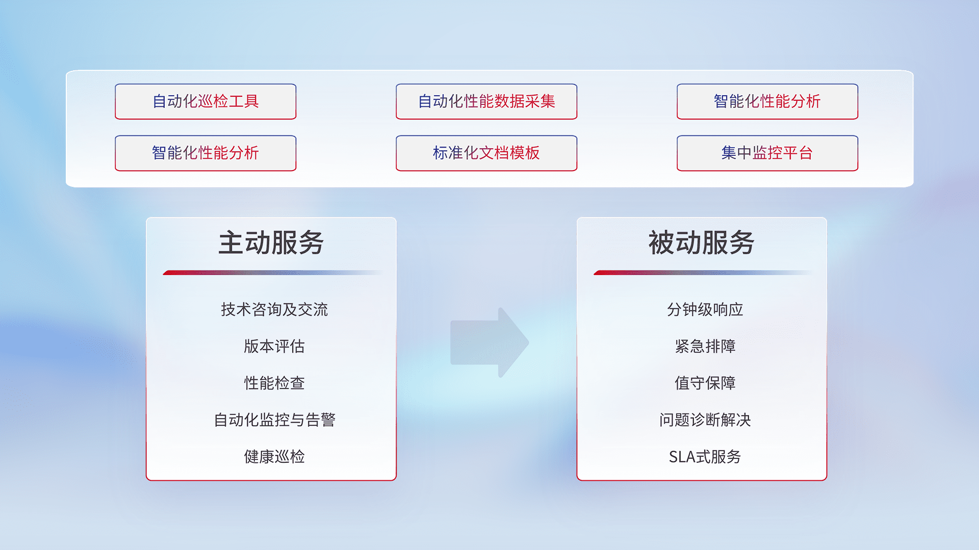智能化工具和标准化文档,,,保障服务质量,,,,提供主动服务(包含技术咨询、、、版本评估、、性能检查、、自动化监控与告警、、、、健康巡检)和被动服务包含(分钟级响应、、紧急排障、、、值守保障、、问题诊断解决、、SLA服务)。。。